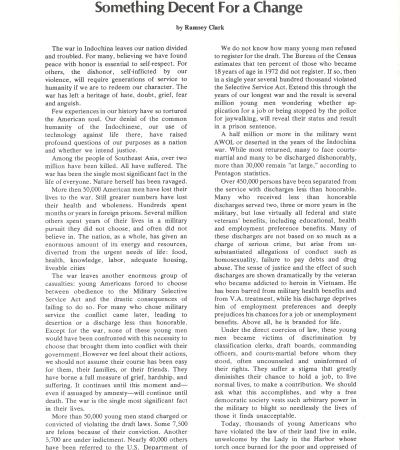 This article was written by Clark, who was the U.S. Attorney General under the administration of President Lyndon B. Johnson. In it, Clark points out that the Vietnam War left deep wounds for both Southeast Asians and Americans, including many young men punished for resisting the draft, deserting, or receiving less-than-honorable discharges. Clark explains that these men, along with their families, still suffer from stigma, lost opportunities, and exile. He calls for full and unconditional amnesty.