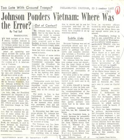 "Johnson Ponders Vietnam: Where Was The Error?" by Ted Sell, Philadelphia Inquirer, December 29, 1968