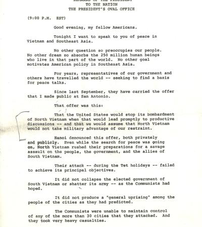 This press release covers a speech delivered by President Lyndon B. Johnson regarding the Vietnam War. He announced that the U.S. would greatly reduce bombing in North Vietnam to encourage peace talks, while still helping South Vietnam defend itself. At the end, Johnson surprised the country by declaring he would not run for a second term as president.