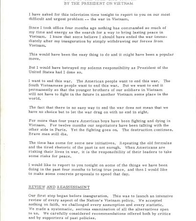 This press release covers the first major televised speech delivered by President Richard Nixon about the Vietnam War. It explains his plan for ending the Vietnam War responsibly. He rejects an immediate withdrawal or defeat, arguing instead for strengthening South Vietnamese forces and negotiating a fair peace that allows the people of South Vietnam to decide their own future.
