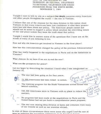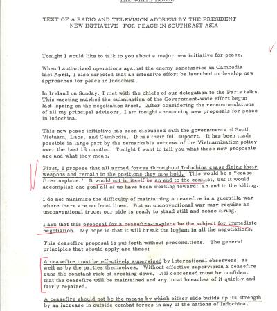 This press release covers a speech delivered over radio and television by President Richard Nixon about the Vietnam War. Nixon explained that while he wanted peace, he would not order an immediate U.S. withdrawal because he believed it would harm America’s honor and security, instead promoting his plan of “Vietnamization,” where South Vietnamese forces would gradually take over the fighting.