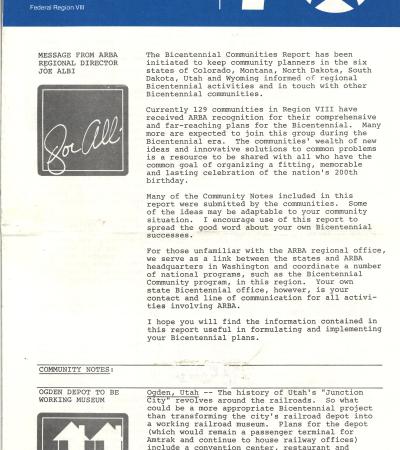 This document covers Bicentennial initiatives in Colorado, Montana, North Dakota, South Dakota, Utah and Wyoming. It was published by the American Revolution Bicentennial Administration regional office.