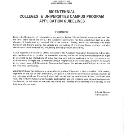 These guidelines provide insight into expectations the American Revolution Bicentennial Administration had for colleges and universities that sought official recognition for their Bicentennial activities.