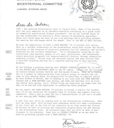 This letter from Nelson to the President of the University of Wyoming asks for his support for the Bicentennial Town Meeting '76 project in Laramie.