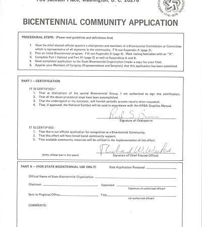 This is the application submitted by Laramie, Wyoming to the American Revolution Bicentennial Administration. It includes a list of thirteen Bicentennial activities that the city envisioned undertaking.