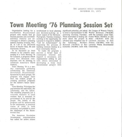 "Town Meeting '76 Planning Session Set", Laramie Daily Boomerang, November 23, 1975