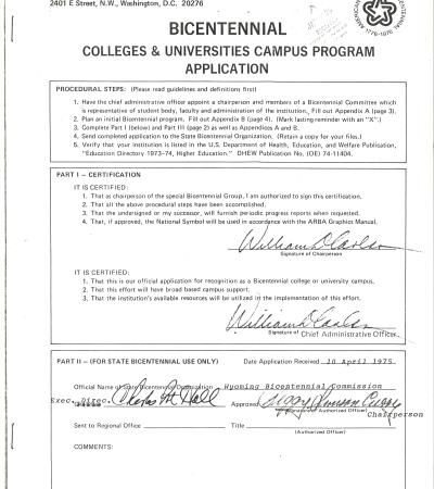 This is the application submitted by the University of Wyoming to the American Revolution Bicentennial Administration. It includes a list of eleven activities being planned at the University in celebration of the Bicentennial.