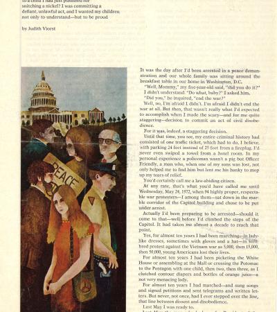 Viorst was an American writer, journalist, and poet. She writes about why she chose to be arrested during an antiwar protest against the Vietnam War. She describes her decade-long journey from peaceful marches to an act of civil disobedience, emphasizing her moral struggle with breaking the law for a cause she believed was just.