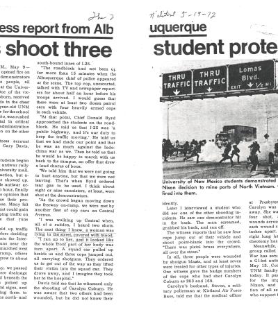 This article describes how police in Albuquerque, New Mexico, shot and injured three student protesters from the University of New Mexico during an antiwar demonstration. The protest began as a peaceful march but escalated when students blocked an interstate highway, leading police to use tear gas and later open fire. Witnesses reported chaos and confusion as the crowd scattered, and the injured students were taken to the hospital in critical condition.