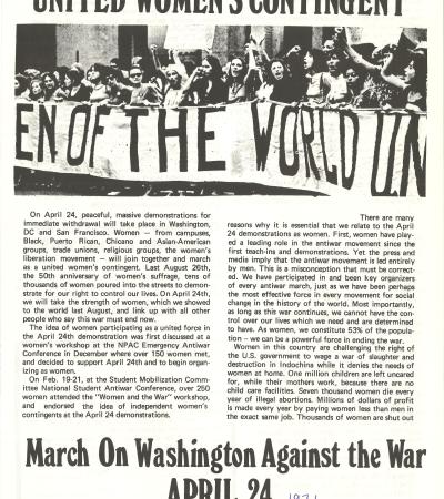 The flyer calls for women across the U.S. to unite and participate in antiwar demonstrations on April 24, 1971, in Washington, D.C. and San Francisco. It emphasizes women’s long-standing leadership in social change movements and argues that the Vietnam War slaughters innocents and also prevents women from achieving equality and control over their lives.